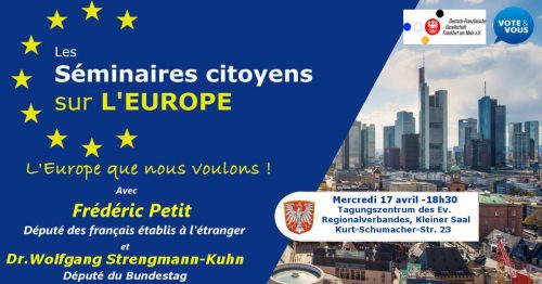 Frédéric Petit, député des Français à l’étranger à l’Assemblée Nationale et Wolfgang Strengmann-Kuhn, membre du Bundestag, vous invitent à un séminaire citoyen binational. Dans la perspective des prochaines élections européennes en mai 2019, ce séminaire sera l’occasion pour les citoyens français et allemands de discuter d’Europe.